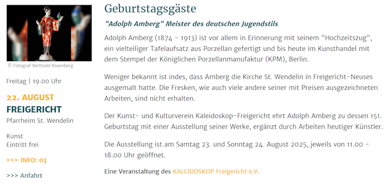 151. Geburtstag Adolph Amberg 08-2025 22. August 2025 Kaleidoskop Archiv gesamt, Ausstellungen 0 Mehr lesen über Adolph Amberg Weitere Infos auf kultursommer-hessen.de Fotos Berthold Rosenberg Pressestimmen GNZ vom 22.08.2025 – Zu Gast bei Adolph Amberg GNZ vom 26.08.2025 – Fest voller Begegnungen und Geschichte GNZ vom 26.08.2025 – Harmonischer Ausklang des Jubiläums